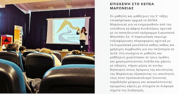 Στα πλαίσια του εκπαιδευτικού προγράμματος «Δράση Για Τα Δάση», οι μαθητές της Ε' τάξης του σχολείου μας συμμετείχαν στο πρόγραμμα «Ευρωπαϊκό Μονοπάτι Ε6» του ΚΕΠΕΑ Μαρώνειας τη Δευτέρα 20 Οκτωβρίου. Στόχος του προγράμματος ήταν να ενημερωθούν οι μαθητές σχετικά με τα Ευρωπαϊκά Μονοπάτια και ειδικότερα για το Ευρωπαϊκό Μονοπάτι Ε6, που ξεκινάει από τη Σουηδία και καταλήγει στο όρος Σάος ή αλλιώς Φεγγάρι στο νησί της Σαμοθράκης. Αφού ολοκληρώθηκε η ενδιαφέρουσα παρουσίαση, οι μαθητές και οι μαθήτριες του σχολείου μας χωρίστηκαν σε τρεις ομάδες και, εξοπλισμένοι με πυξίδες και χάρτες με οδηγίες, πήραν μέρος σε ένα διασκεδαστικό παιχνίδι θησαυρού στους δρόμους της κοινότητας της Μαρώνειας, με στόχο την εξάσκηση των ικανοτήτων προσανατολισμού τους. Στη διάρκεια της δραστηριότητας συνέλεξαν κάρτες με γρίφους κρυμμένες σε διάφορα σημεία και, αφού έλυναν τον κάθε γρίφο, σημείωναν την απάντηση σε φύλλα εργασίας και συνέχιζαν στο επόμενο σημείο. Πληροφορίες και φωτογραφίες από την υλοποίηση του προγράμματος περιλαμβάνονται στο παρακάτω βίντεο.‘Ένα θερμό ευχαριστώ από καρδιάς στην υπεύθυνη του ΚΕΠΕΑ Μαρώνειας κα Δάφνη Κυνδελέρου καθώς επίσης και στους εκπαιδευτικούς των δύο τμημάτων της Ε’ τάξης Μαρία Γιαννοπούλου και Γιώργο Παπατριανταφύλλου που συνόδεψαν και στήριξαν τους μαθητές και μαθήτριες κατά την υλοποίηση του προγράμματος. Η παιδαγωγική ομάδα του προγράμματος: Βασιλική Κωσταρά, Δήμητρα Δημητρακοπούλου, Μαρίνα Μπανταλίδου. ΚΛΙΚ ΕΔΩ: Ευρωπαϊκό Μονοπάτι Ε6' (Video) |